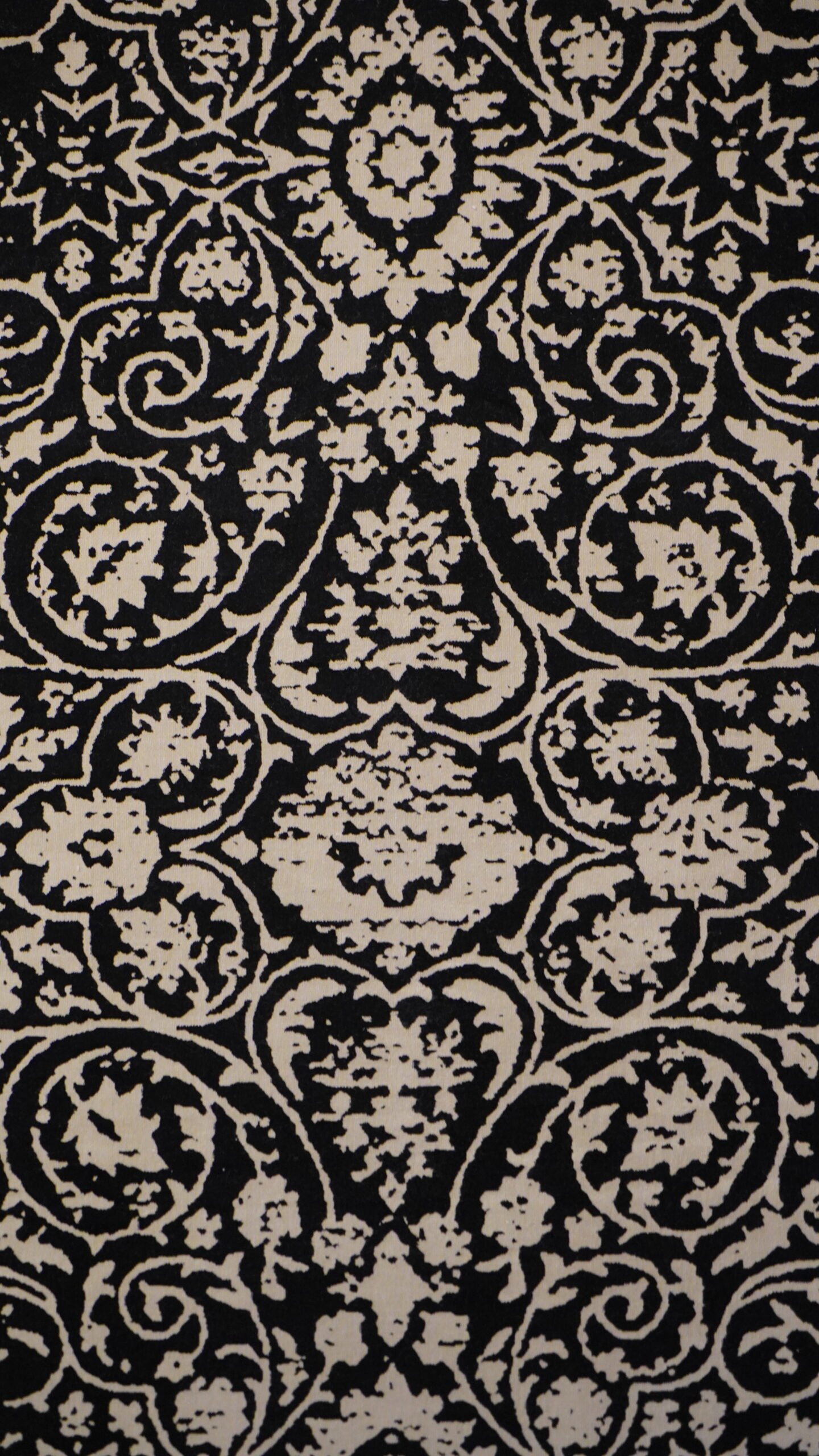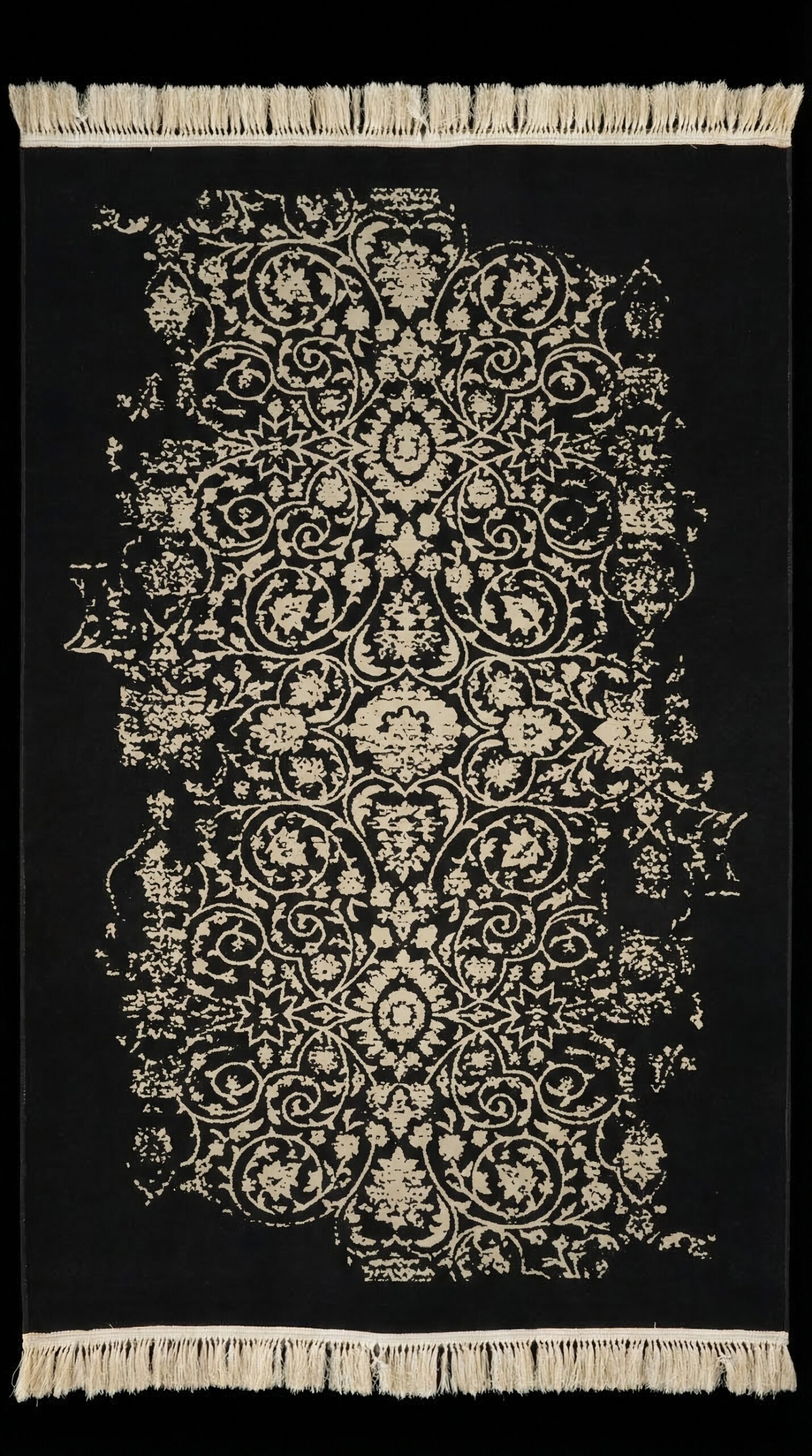 The deep black background gives a strong and luxurious feel, while the soft beige ornamental pattern adds a refined artistic touch. This contrast makes the carpet stand out beautifully in any modern space.
