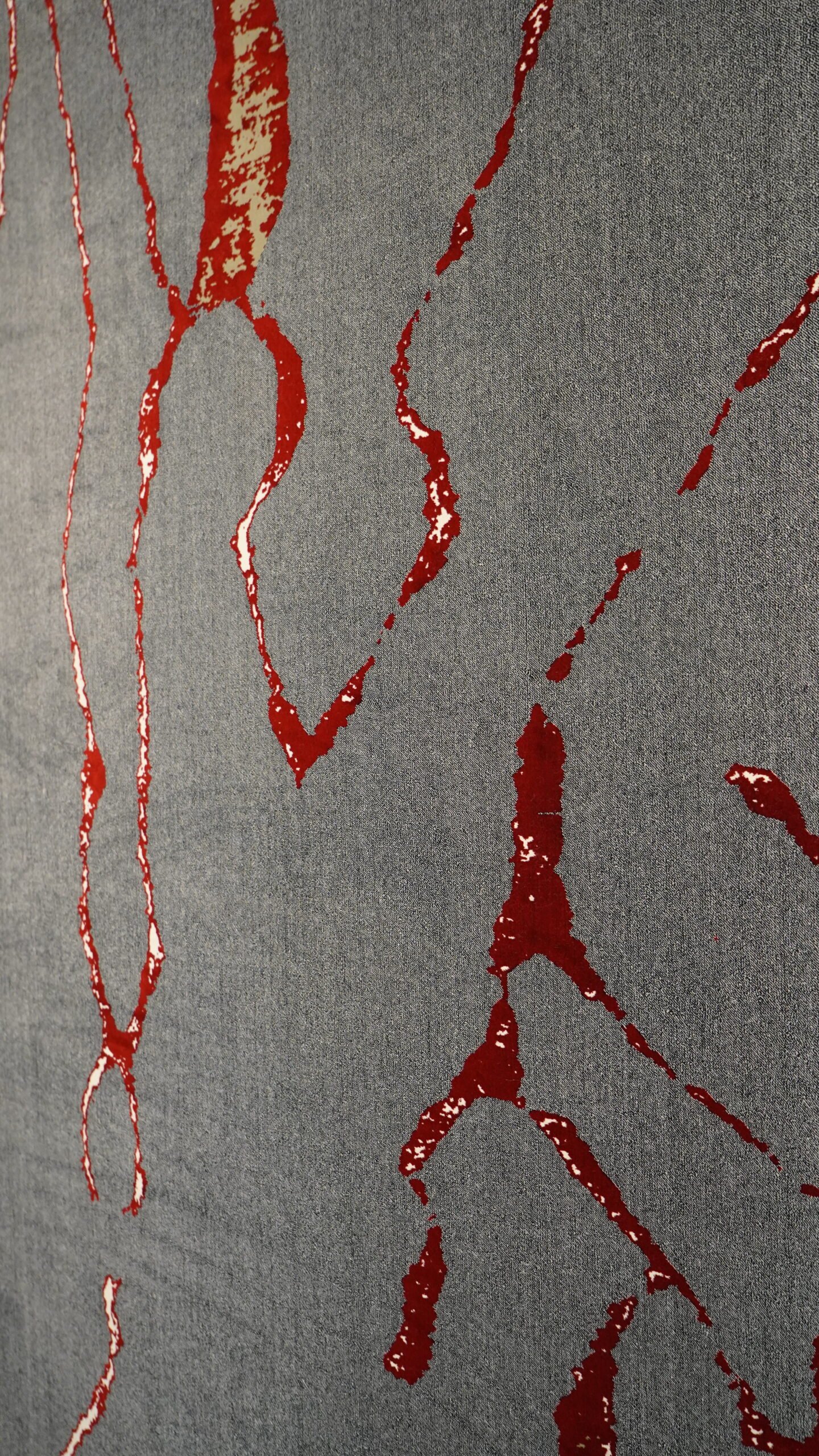 This carpet features a soft grey background with striking abstract lines in deep red tones, creating a strong artistic expression. The design feels like a piece of modern art, making it more than just a carpet—it becomes a statement element in your space.
