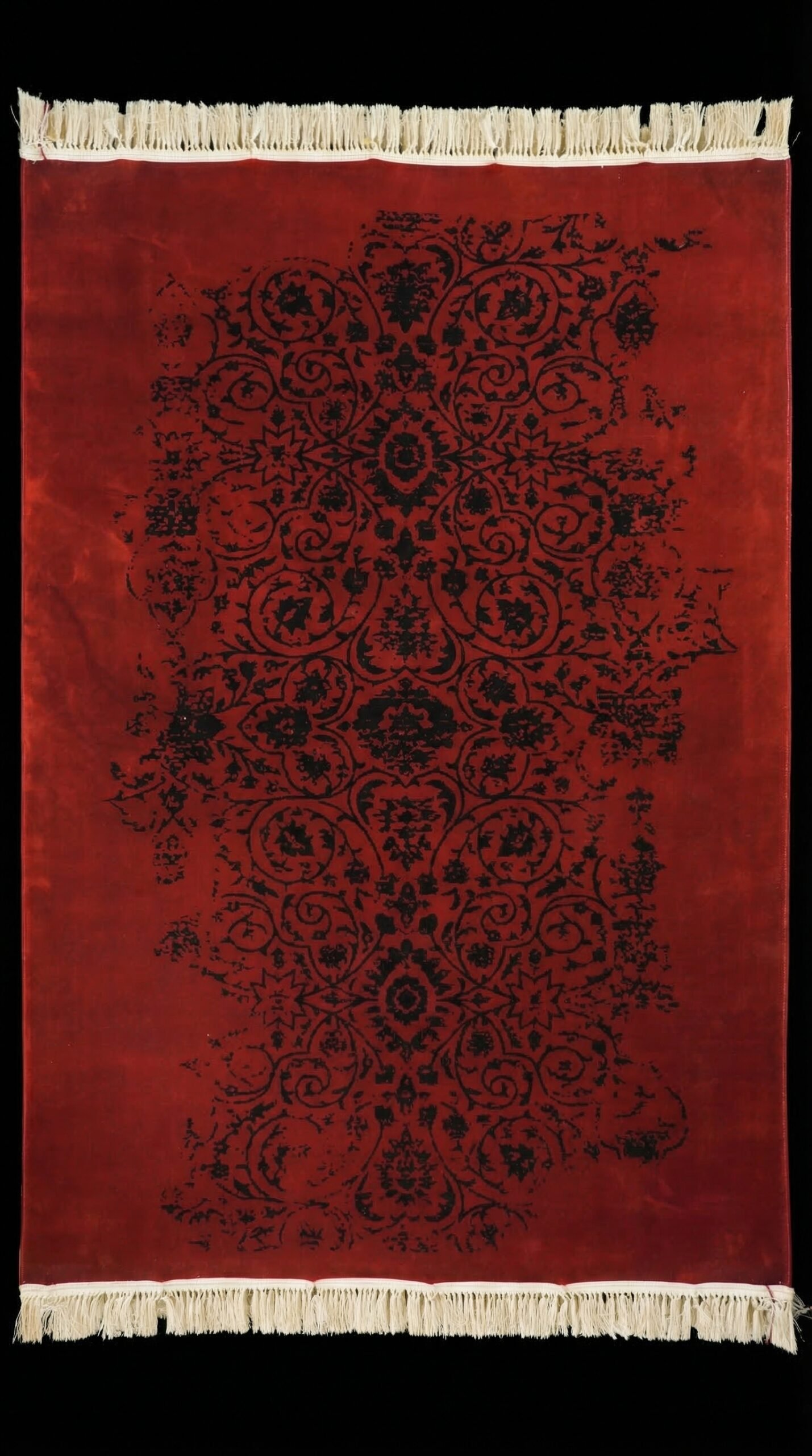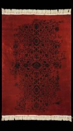 This carpet features a strong deep red background with artistic black Persian motifs that appear in a faded vintage style. The design creates a modern and stylish look while still preserving the identity of traditional Iranian patterns.