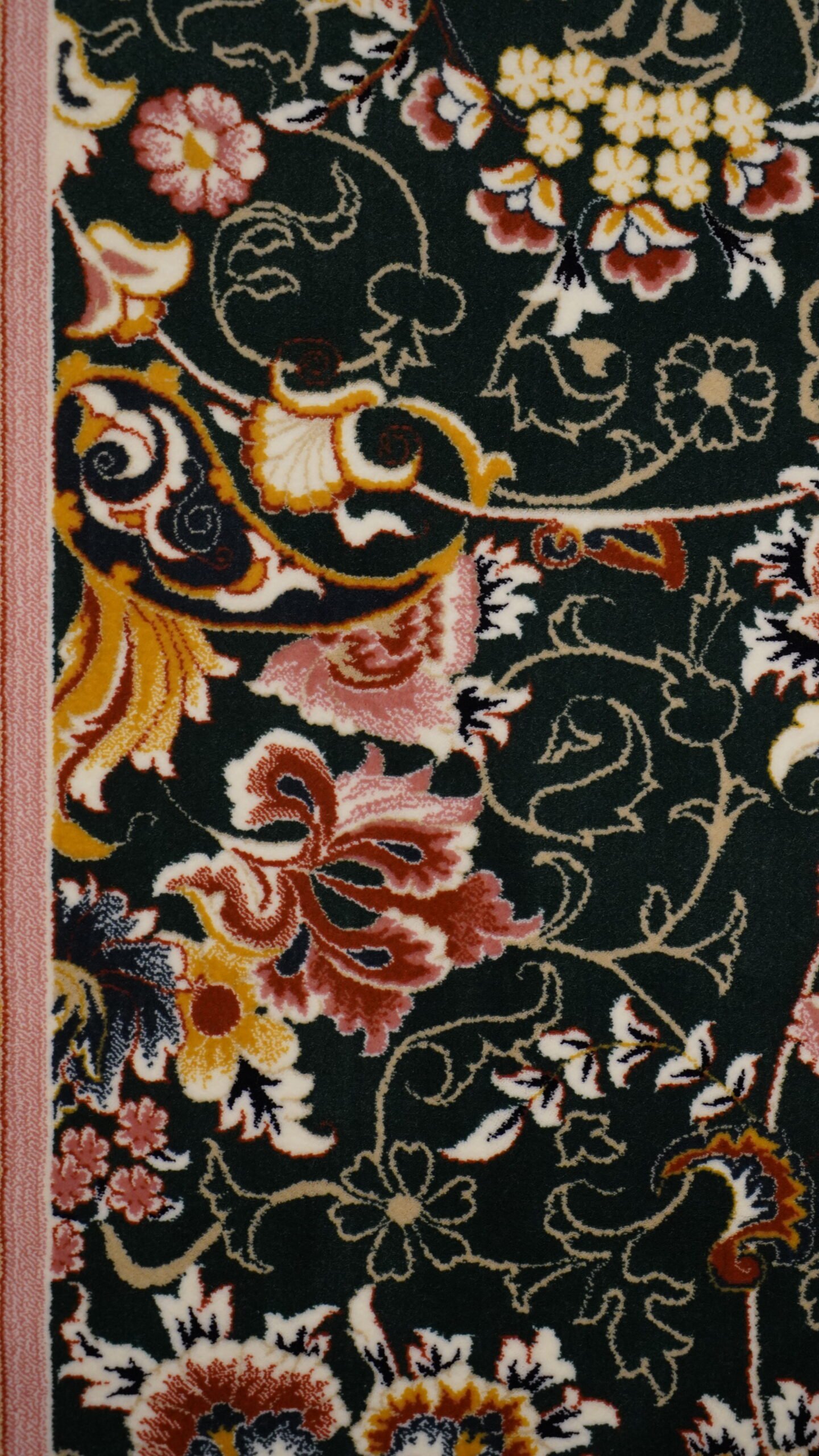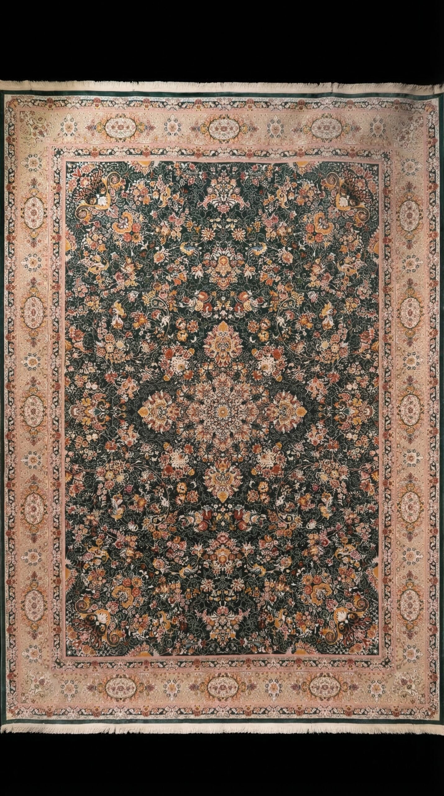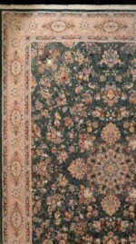 This carpet features a rich dark green background filled with delicate Persian floral motifs and artistic ornaments. The elegant border frames the central pattern perfectly, creating a balanced and visually stunning composition that enhances the beauty of any interior space.