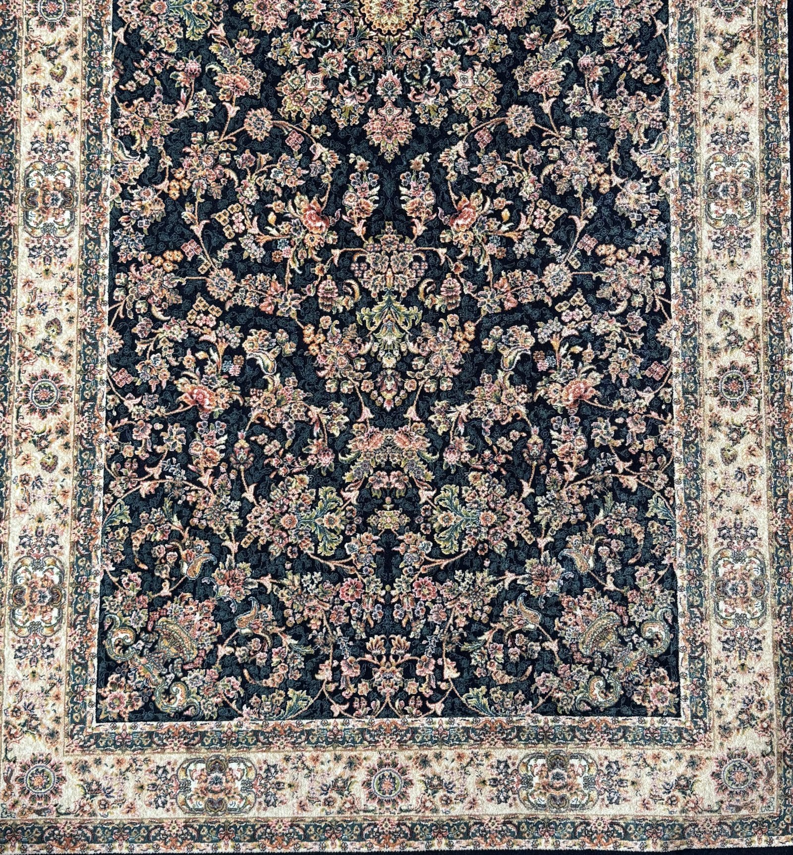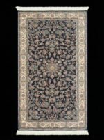 The Silk Carpet Oman 1200 Reeds 1×2 Navy is a perfect blend of elegance and craftsmanship. Featuring a deep navy background with intricate floral Persian patterns, this carpet creates a rich and sophisticated look that enhances any interior.