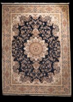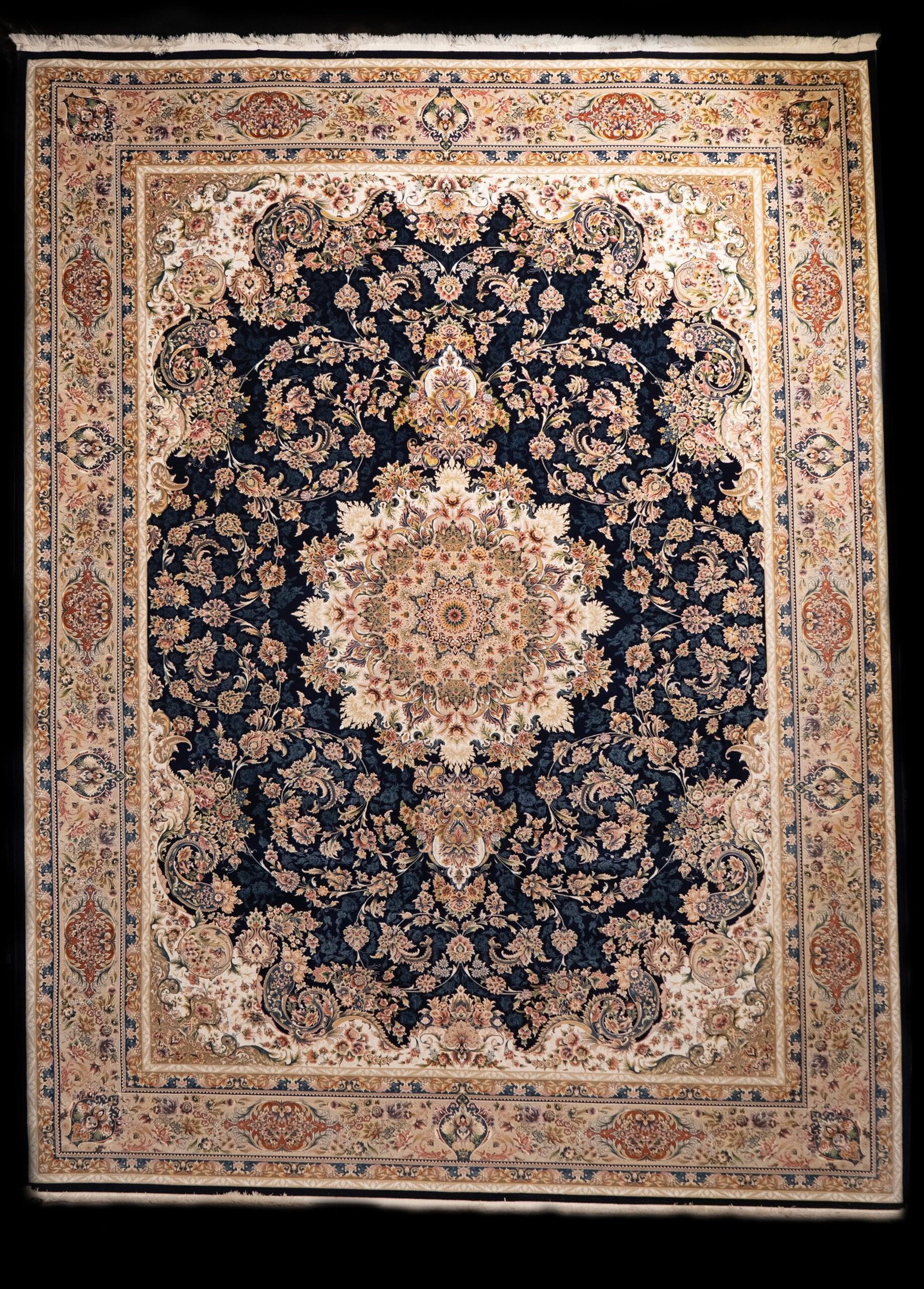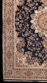 This carpet features a deep navy blue background highlighted by an intricate floral medallion at the center. The rich combination of ivory, gold, soft red, and beige tones creates a striking contrast that enhances the luxurious appearance of the rug.